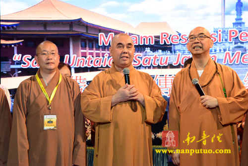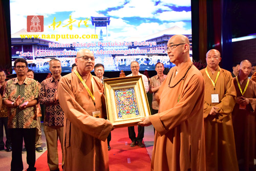 2017年5月29日,中国佛教协会副会长、厦门市佛教协会会长、南普陀寺方丈、闽南佛学院院长则悟大和尚带领厦门市佛教协会暨闽南佛学院第十五届本科毕业班“重走海上丝绸之路”参访团一行138人,在印尼佛教中心协会会长、大丛山西禅寺方丈慧雄大和尚的陪同下,从棉兰飞抵印度尼西亚首都雅加达参访大丛山西禅寺,并参加“一带一路·传达和谐丝绸之路”交流晚会暨闽南佛学院校友会印尼分会挂牌揭幕仪式。当晚,厦门市佛教协会常务副会长定恒法师、副会长界象法师、副会长法云法师、副会长兼秘书长净心法师、副会长世澄法师等来自海内外的诸山长老、南北传佛教的大德法师、省市各级领导、不同宗教信仰的嘉宾,以及佛教在家信众等近千人共同见证了这一庄严而又神圣的时刻。 当地时间晚上7时许,“一带一路·传达和谐丝绸之路”交流联欢晚会暨闽南佛学院校友会印尼分会挂牌揭幕仪式在印尼著名的佛教道场大丛山西禅寺举行。热情的印尼善信以精彩的舞龙表演欢迎贵宾们的到来,在鲜花、宝幢的簇拥下,慧雄大和尚邀则悟大和尚一行缓缓步入晚会现场,于佛前燃香礼拜,南北传法师分别以不同的语言讽诵经咒,普为大众回向祈福。 慧雄大和尚致欢迎辞说,中印佛教在历史上因缘深厚,借则悟大和尚带领闽南佛学院学僧参访团一行到印尼这一因缘,我们相互传达了“一带一路”和谐与包容的精神。今日,则悟大和尚率参访团一行,踏上以往中国大德所走过的路,传承祖师大德们为法忘躯的精神,为中印佛教的交流掀开了新的篇章。在此,让我们虔诚的祈愿世界和平,祈祷不同的信仰都能在印尼相互融合、和谐发展,祝愿大家福慧增长,法喜充满。 则悟大和尚代表中国厦门佛教协会、闽南佛学院以及参访团一行对与会大德、来宾表示衷心的祝福。大和尚说,南普陀寺是观世音菩萨的道场,观世音菩萨是慈悲与智慧的化身,正是在观世音菩萨的加持下,今天才有机缘来到印尼。闽南佛学院是中国汉传佛教历史最悠久的学院,闽院首任院长会泉长老在民国时期曾远下南洋,到印尼弘法。如今,闽院学子遍布世界各地,为佛教发展与弘法利生事业做出贡献。今天,我们举行闽南佛学院校友会印尼分会揭牌仪式,是希望通过这一平台,能进一步加深厦门佛教与印尼佛教的法谊,共同推动僧伽培养、社会服务、信仰建设、道德建设等方面的发展,希望这个平台能够真正发挥沟通与和谐的桥梁作用,这也是我们成立校友会的初衷。不论是古代的“丝绸之路”,还是如今的“一带一路”,都是和谐、包容的交流之路。世界和谐,人类才能幸福;社会和谐,人民才能安居乐业;家庭和谐,生活才能美满;身心和谐,身体才能健康。和谐,就是佛陀倡导的精神,通过这一平台,我们希望弘扬和谐的理念,并为人类幸福这一共同目标而努力。 随后,在海内外四众弟子、领导嘉宾、各界友好人士的共同见证下,则悟大和尚与慧雄大和尚共同为“闽南佛学院校友会印度尼西亚分会”揭牌,并礼请慧雄大和尚为闽南佛学院校友会印尼分会长,闽南佛学院校友会会长则悟大和尚为慧雄大和尚颁发了证书。 界象法师说,今天大家能聚在一起,因缘殊胜,十分难得。我们都知道,印尼是一个多元文化的国家,也是闽院祖师们曾经弘法的地方。慧雄大和尚与闽南佛学院更是有着深厚法谊,今天的活动能圆满举行,也是得益于慧雄大和尚的加持。借此因缘,再次感恩慧雄大和尚的支持与帮助,也祝愿西禅寺在慧雄大和尚的住持领导下,佛日增辉,法轮常转。 接着,净心法师介绍海外校友会的缘起:闽南佛学院毕业僧参访团一行138人在院长则悟大和尚的带领下,追随佛陀的脚步,行走在“一带一路”上,遍访善知识,传达和谐,友好交流。大家都知道佛教源自印度,在中国发扬光大,在东南亚得到传承。此行,沿着祖师先贤的弘法足迹,一路走来,我们看到了祖师们曾经播撒下的菩提种子如今已枝繁叶茂,也真切感受到祖师大德弘法之艰辛。为了更好地服务国家“一带一路”战略,加强对外交流,促进与沿线国家民心相通,传播佛教文化,我院在印尼及其他国家成立校友会,凝聚世界各地闽院校友的智慧和力量,广泛认识及联系当地善信人士,为复兴优良传统与弘扬佛教文化服务。 晚上22时,晚会在优美的梵呗声中完满落下帷幕。