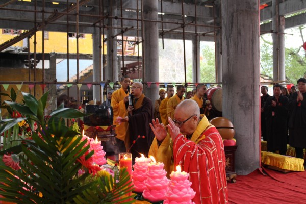 上午9点左右法会如期举行,沐箫古寺以传统的仪仗队,打着香花灯等庄严品,迎请以了法大和尚、教玄法师、宏安法师为主法的三位大德,前往沐箫古寺新建中的大雄宝殿,为大雄宝殿举行上梁法会。法会在宝鼎赞中拉开帷幕,三位主法法师以虔诚心香供养法中王,祈愿世界和平,人民安乐;随后沐箫古寺住持教玄法师说洒净水文后,大众师父和来护法善信同声诵念大悲咒,三位主法法师在大雄宝殿内洒净。随后雁荡山能仁寺方丈了法大和尚为上梁法会说法开示: